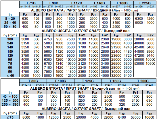 Допустимые значения нагрузок на выходной вал редуктора указаны в таблице. Значения радиальных и осевых нагрузок не должны превышать максимальных значений.